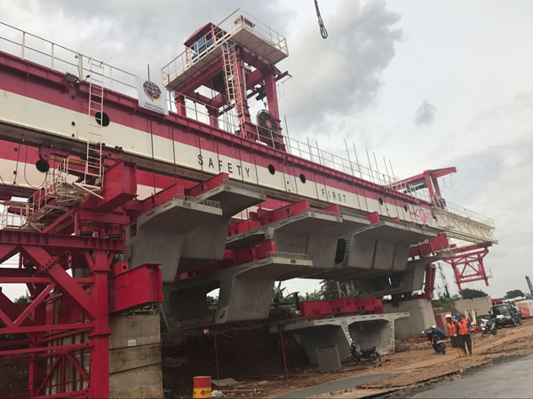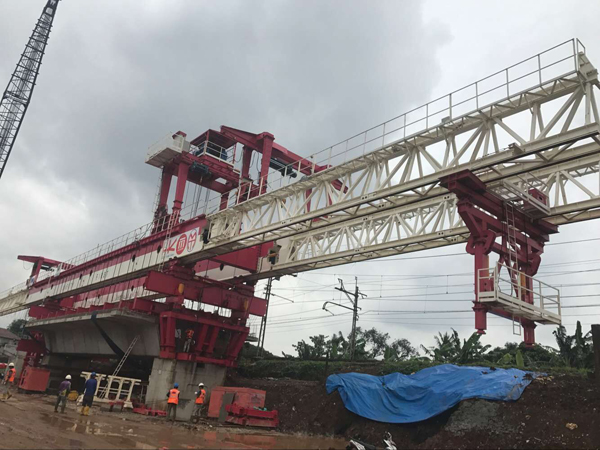 通聯(lián)600t節段拼裝接橋機在印尼雅加達工地順利完成第一片梁的拼裝。